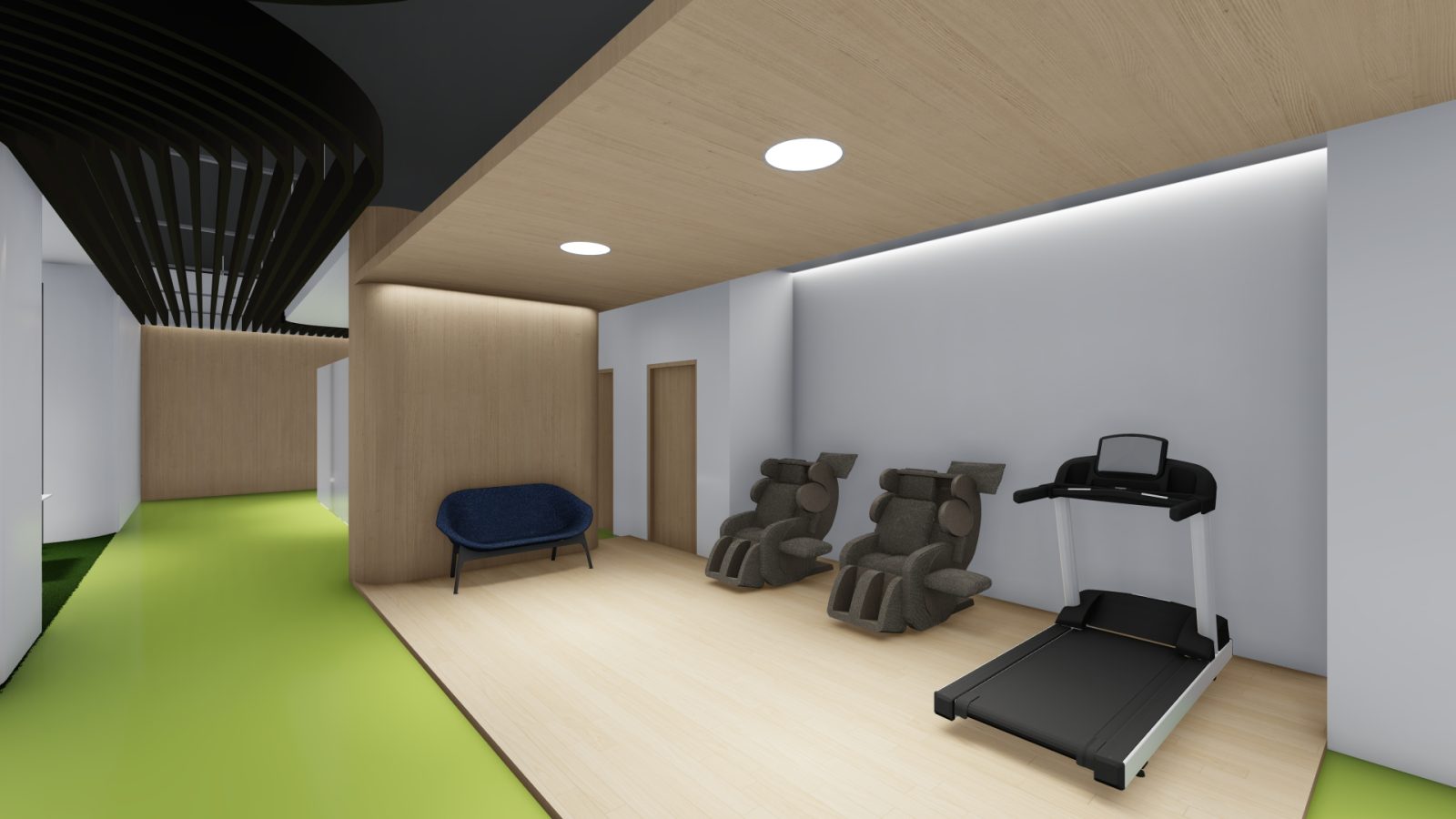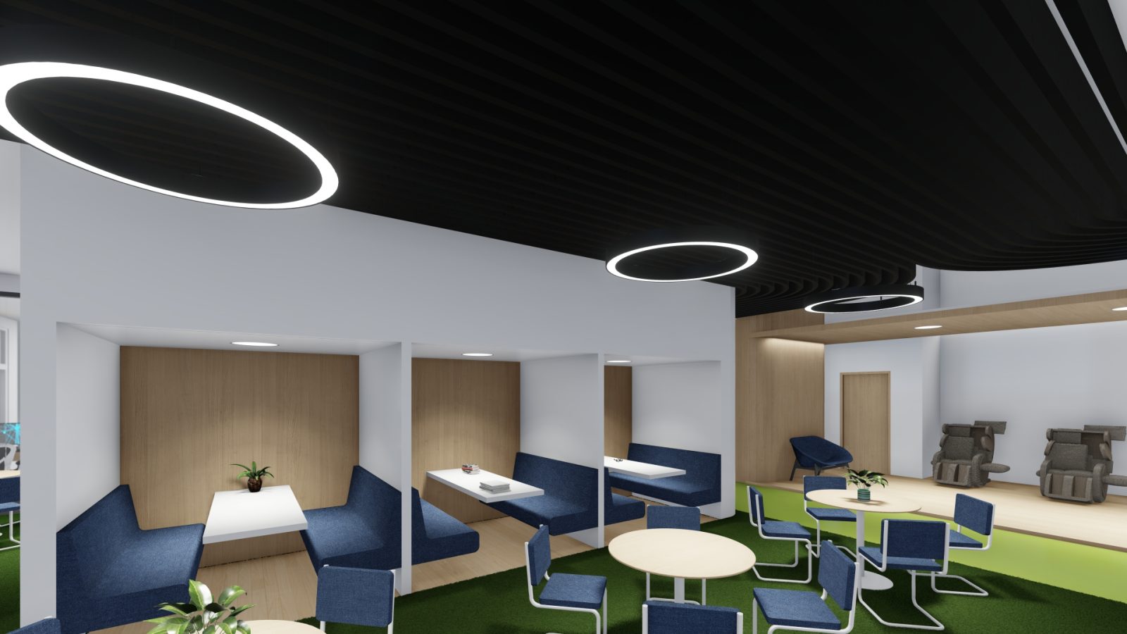 配備空間管理系統、溫濕監測與 Kiosk。休憩區結合飲食 Bar,提供商務型飲水機、微波爐及放鬆桌椅,打造辦公休閒並重的工作環境。