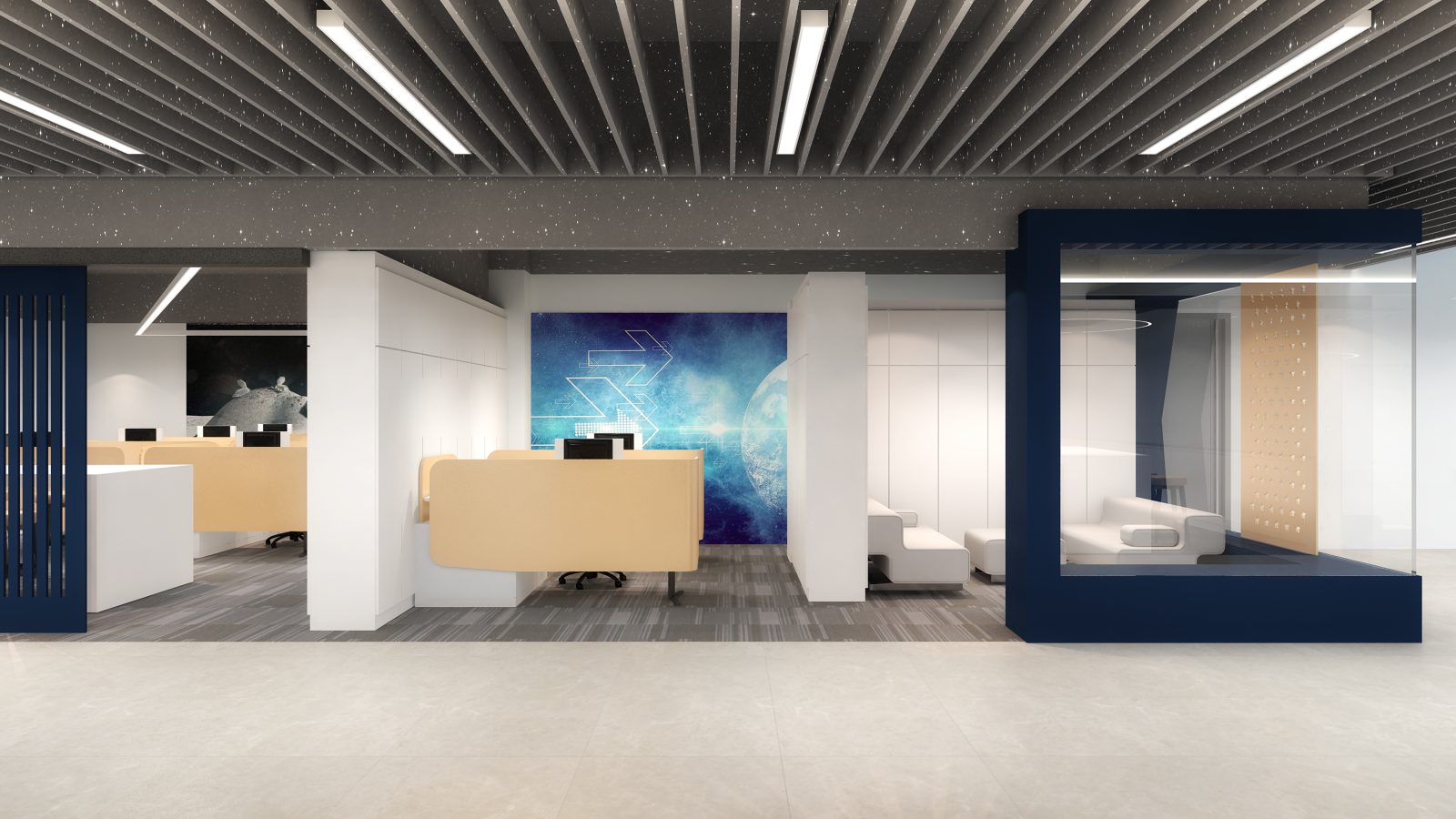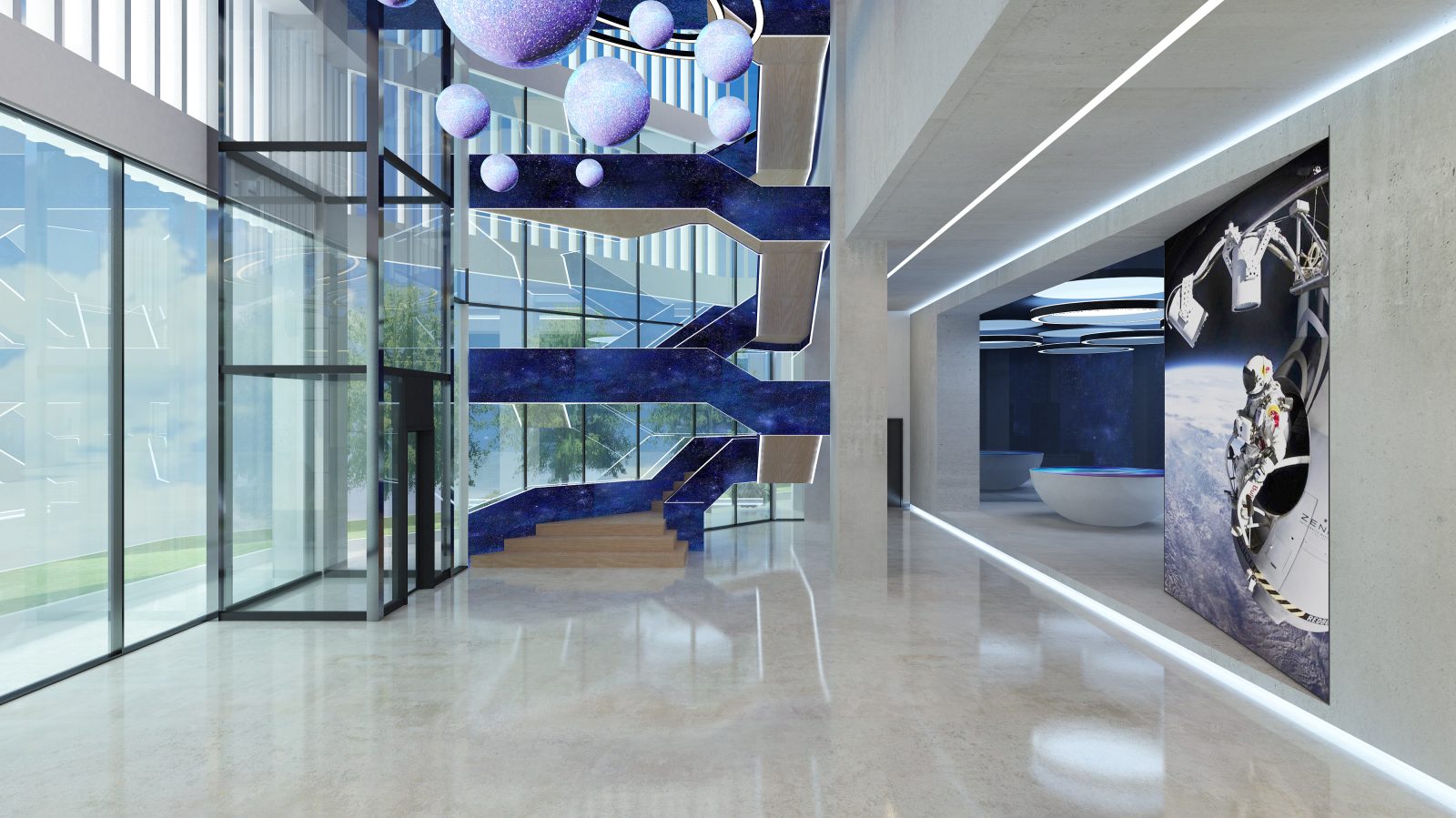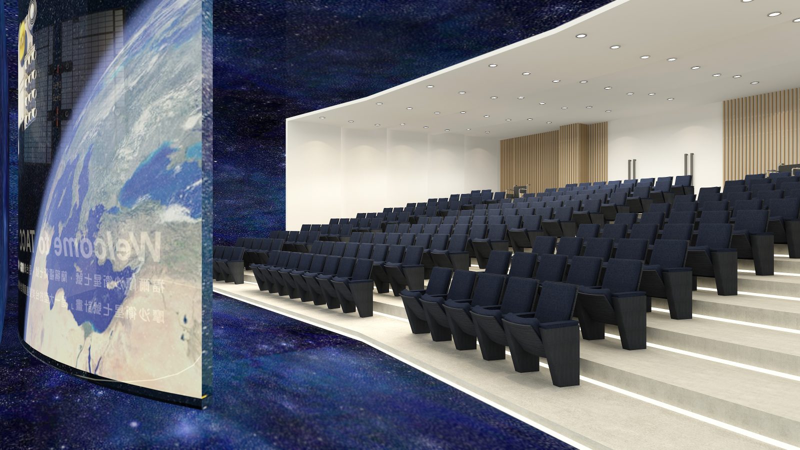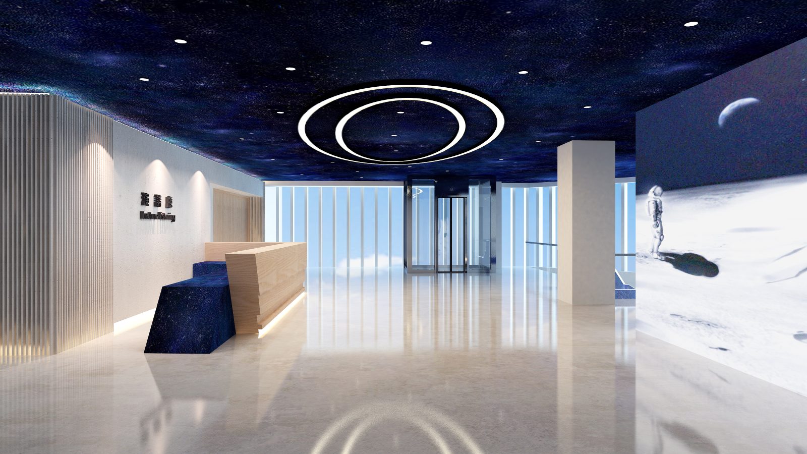 入口大廳利用天花高度由壓縮轉向挑高的變化,塑造強烈的空間張力。預留大型實境投影空間,未來可在此打造身歷其境的航太氛圍體驗。