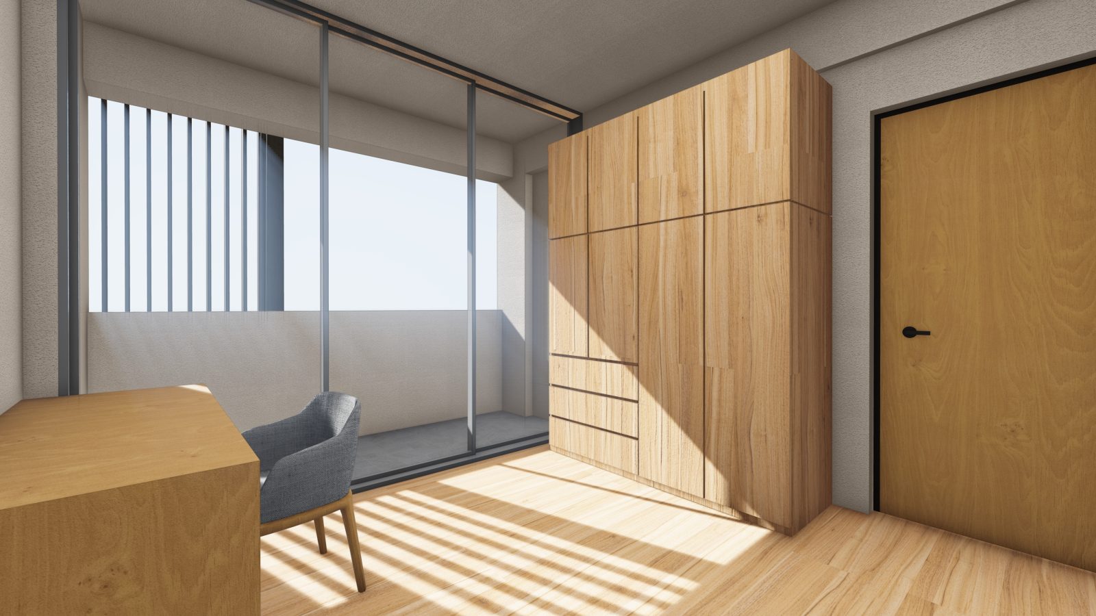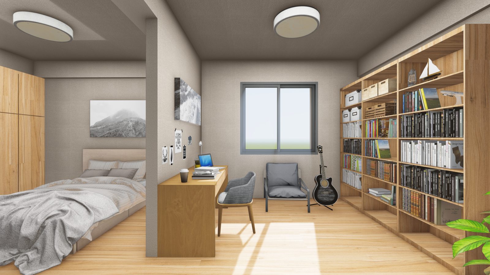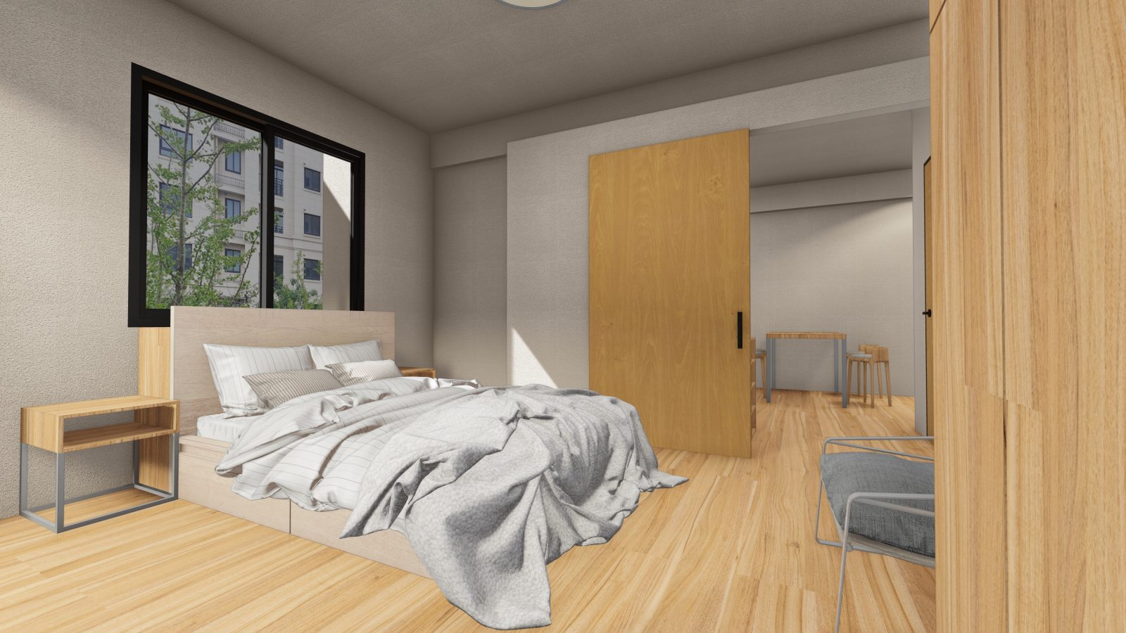 本專案針對師大公館校區研究生宿舍進行全面翻修。外觀以「ㄇ字型」量體重塑門面,運用師大紅與垂直隔柵整合視覺焦點。空間規劃亮點在於 B1 多功能層,將原本的防空避難空間轉化為集健身、咖啡交流、自修閱覽於一體的現代化交誼廳;住宿單元則採胡桃木色家具搭配落地防焰遮光窗簾,建構簡潔、尊貴且大方的生活尺度,為研究生活注入溫暖的人文氣息。