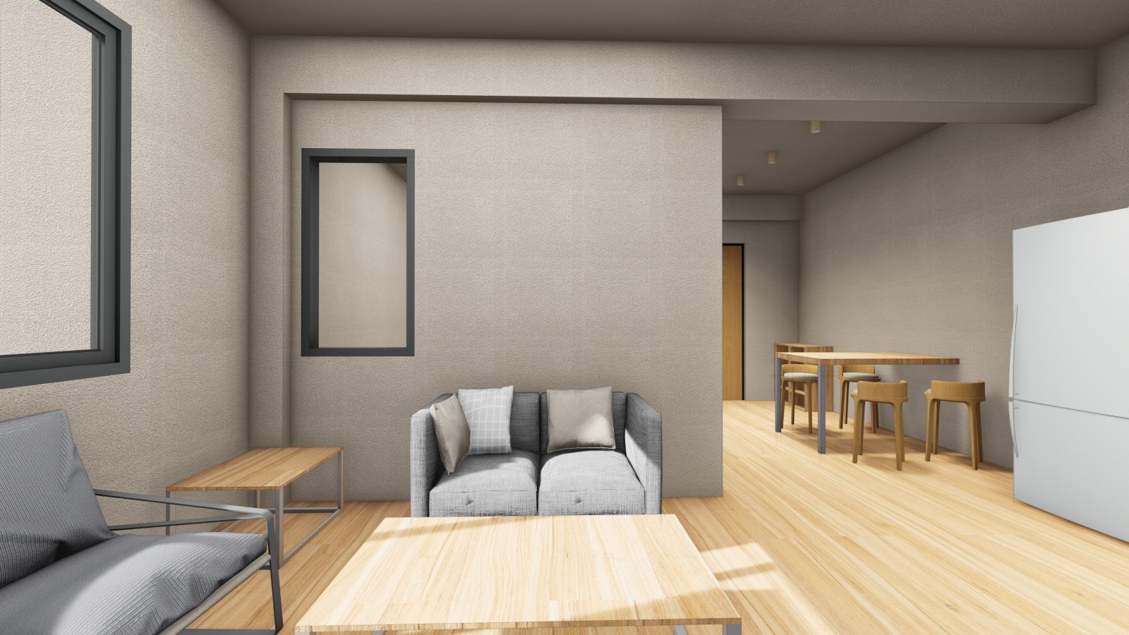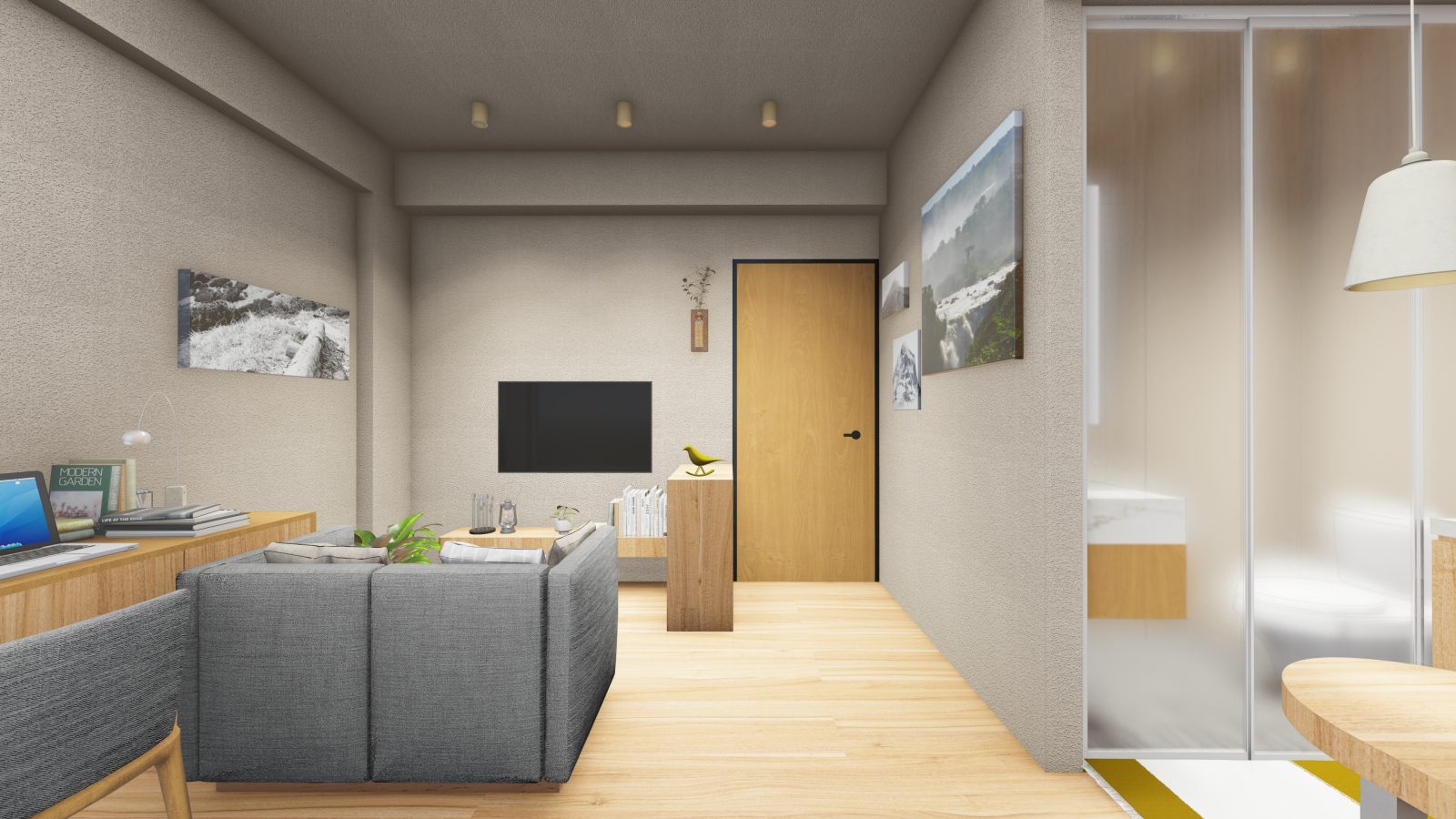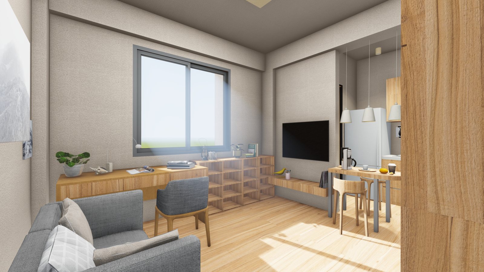 採用胡桃木家具搭配橡木染色,壁面選用淡米白色營造柔和感,地板鋪設高質感 PVC 地坪,提升居住質感。