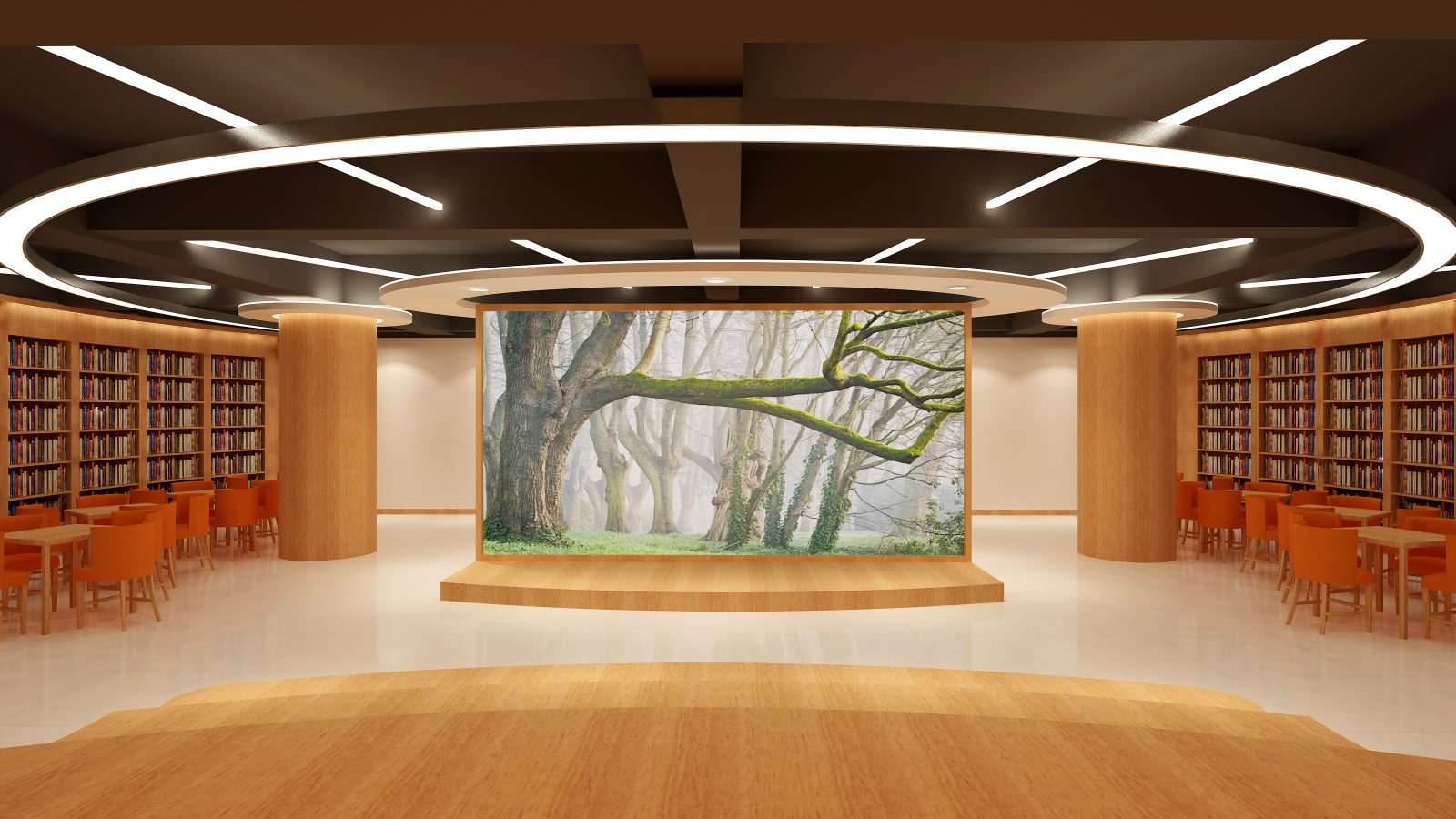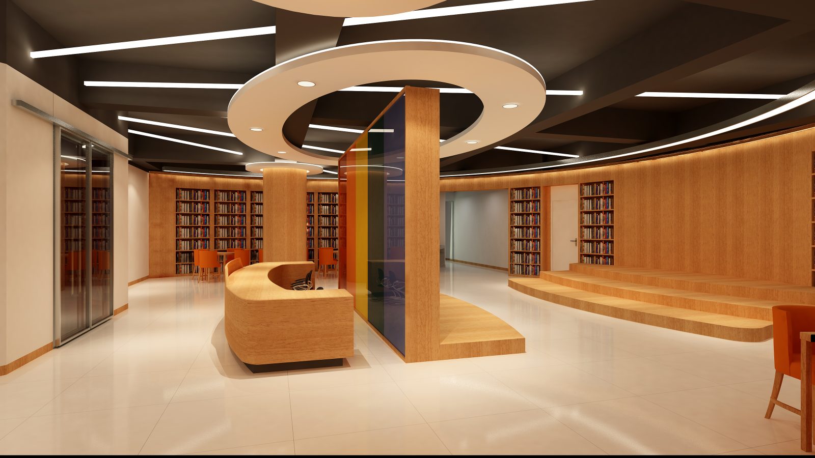 整合親子烘焙、共讀區與階梯式故事空間。利用圓形高矮櫃作為空間半區隔,維持視覺通透感,同時保障幼童在遊戲區的安全性。