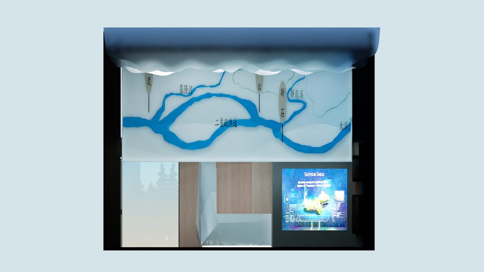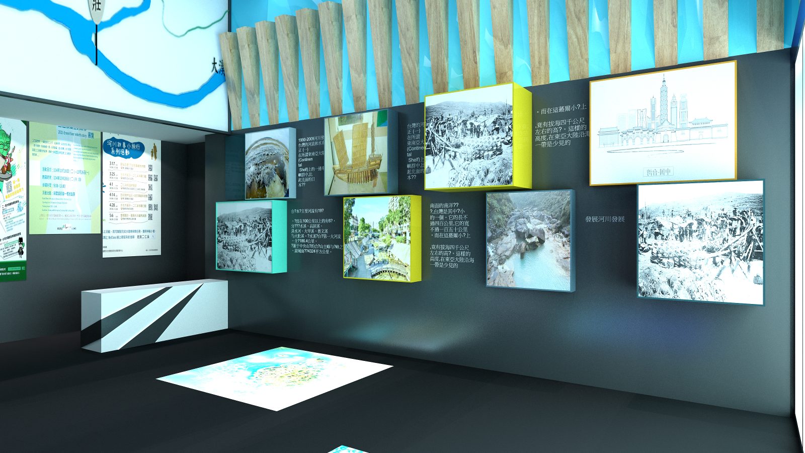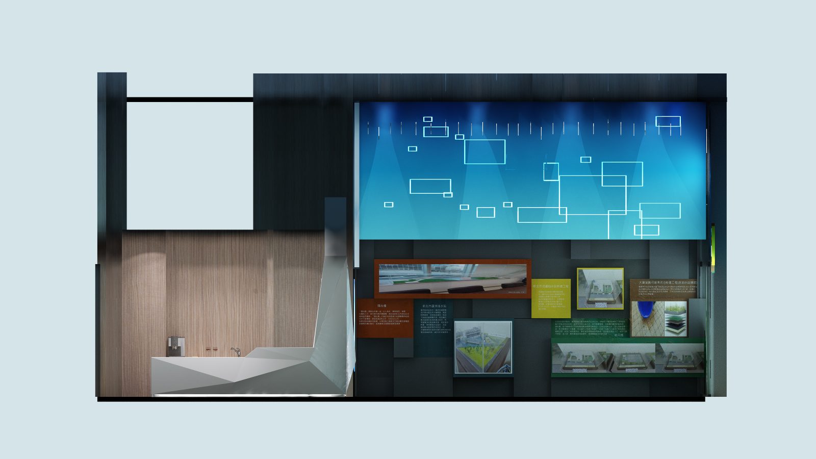 設計計畫:水利流域冷色調 / 自然溫潤木紋 / 耐磨損金屬材質 / AR 互動展示模組