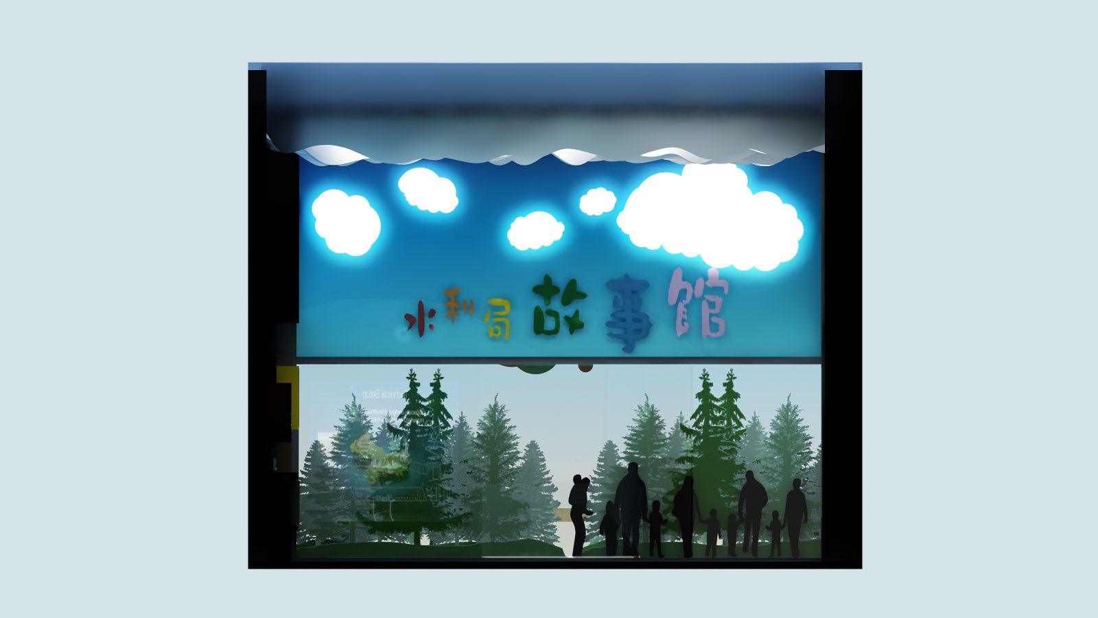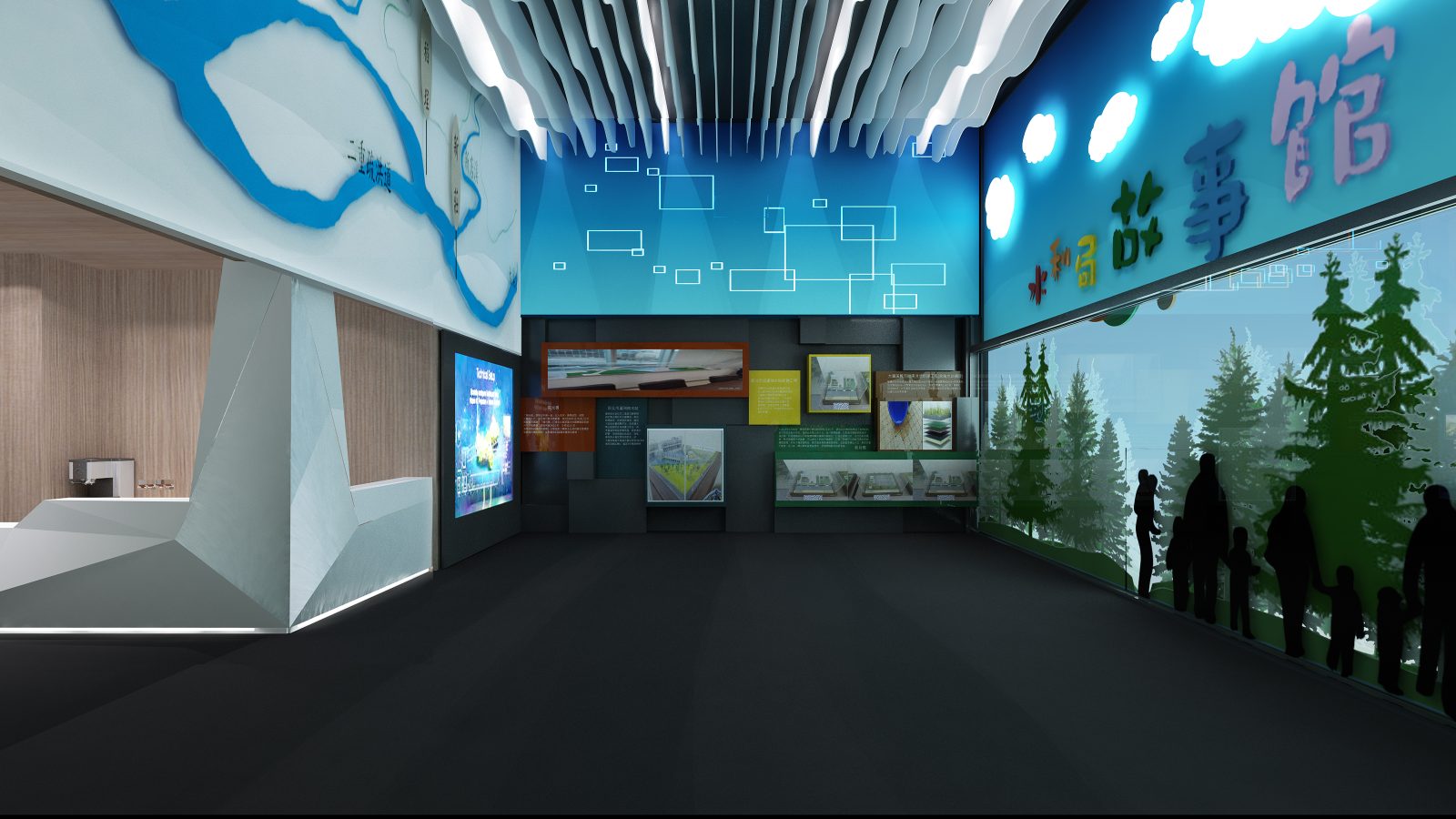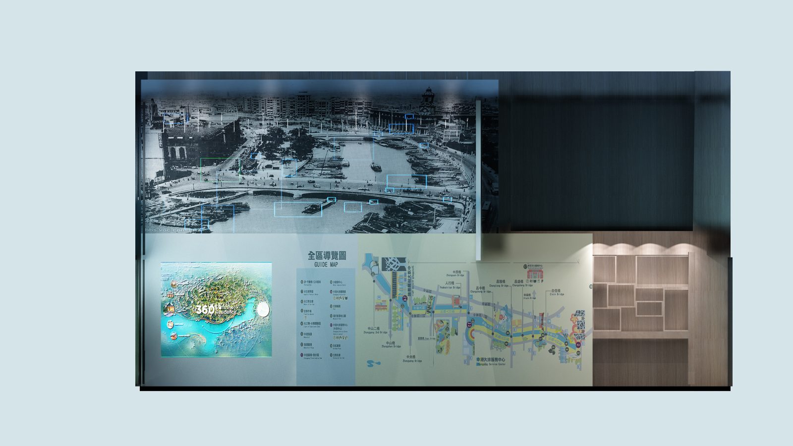 設計計畫:水利流域冷色調 / 自然溫潤木紋 / 耐磨損金屬材質 / AR 互動展示模組