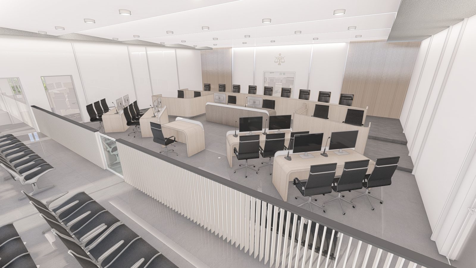 本計畫為臺灣臺北地方法院落實國民法官制度之核心建置案。設計理念以動線匯聚營造社會對話意象,透過白色基調象徵司法清雅,並融入木質紋理與人性化圓角設計,淡化傳統法庭的沉悶壓迫,營造出一個利於跨界交流、充滿透明感的法治翻轉場域。