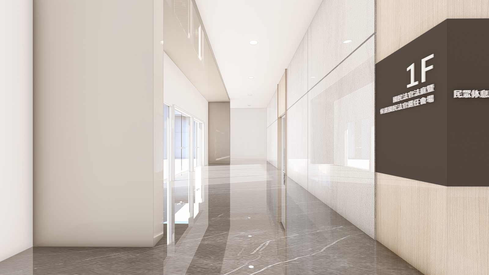 「藉由三段式分流動線匯聚對話意象,在白色基調與暖木質感中,打造平易近人卻不失莊嚴的新世代司法空間。」