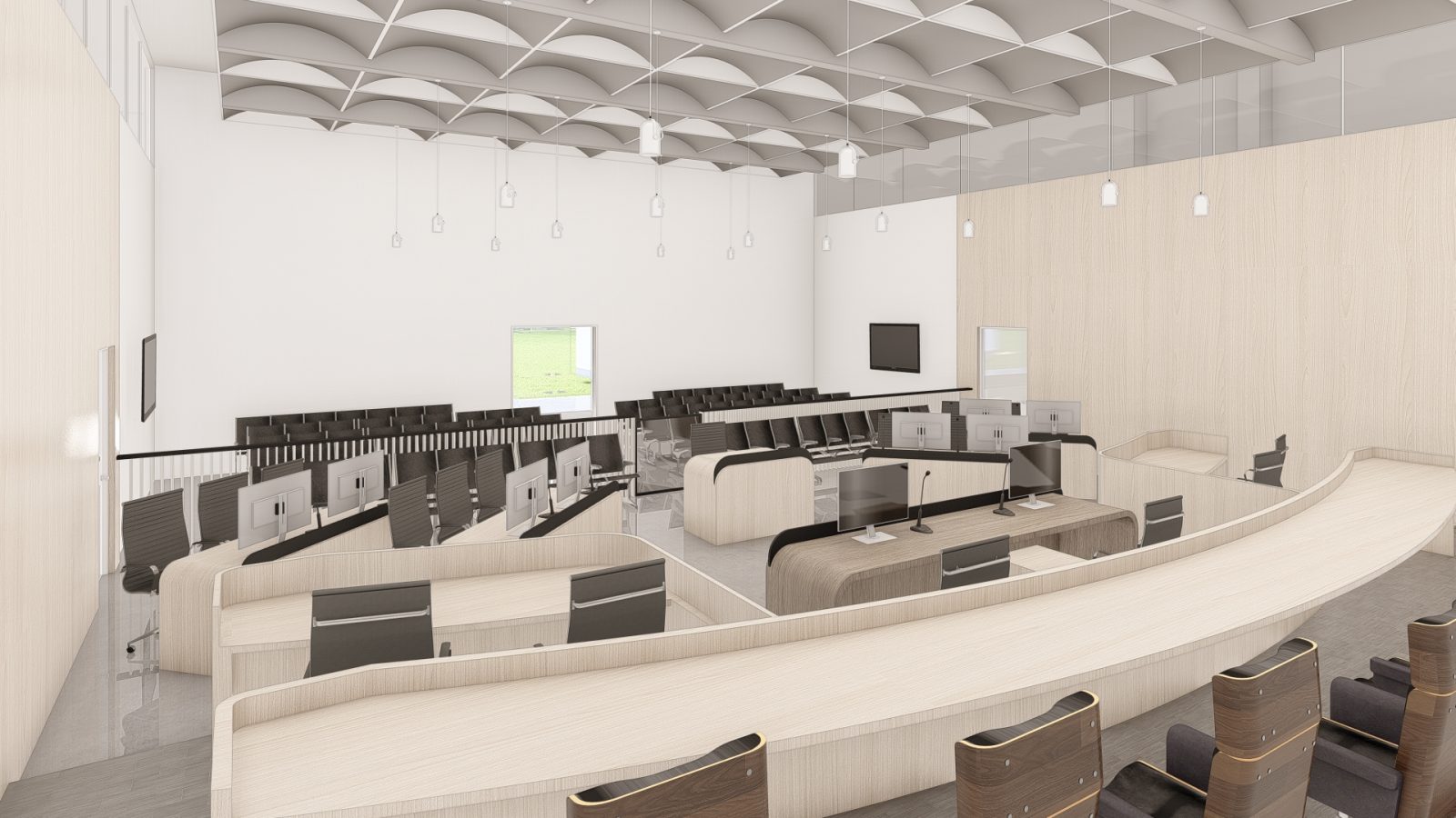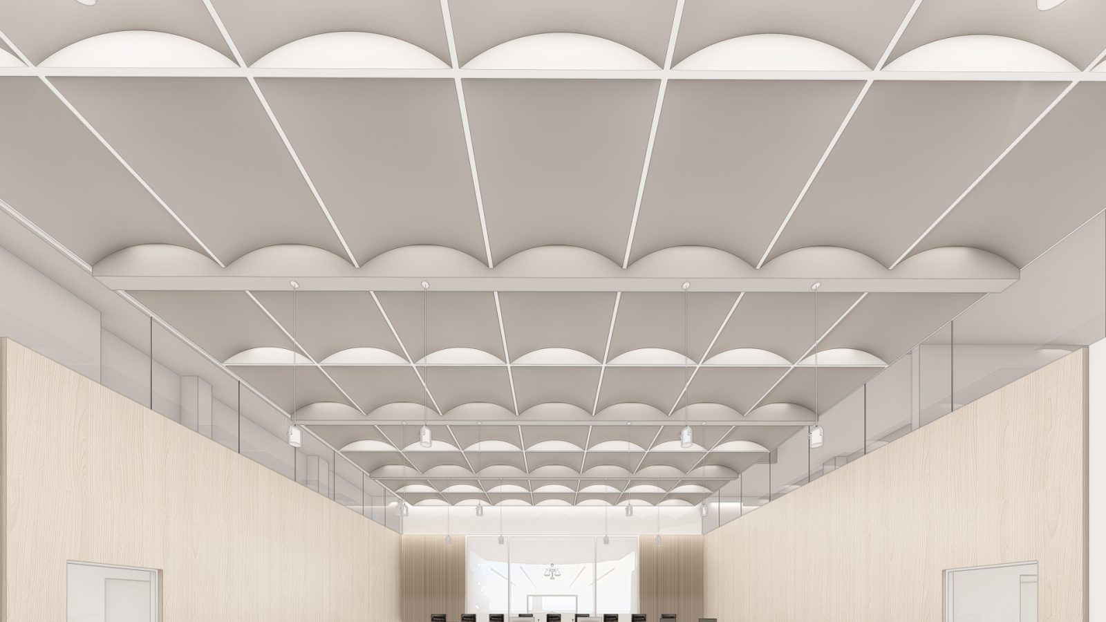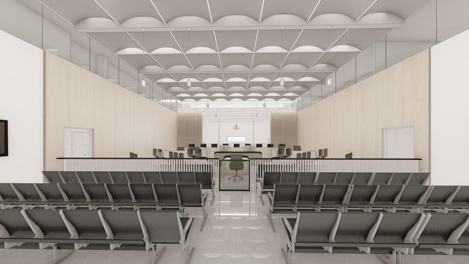 一樓法庭採用多曲面造型設計,柔和了原本僵硬的空間線條,擺脫沉重氣氛並為空間添加藝術趣味性。