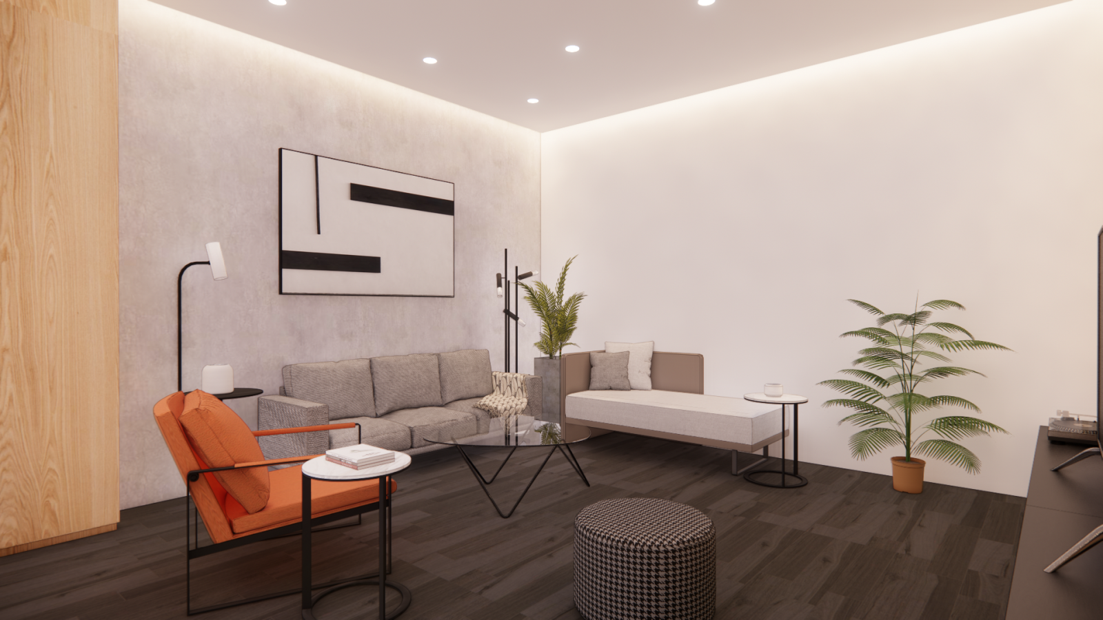 採暖白光與灰白牆產生穩定安心感,利用光線、家具到地板的漸層選色搭配,達成高品質的放鬆功能。