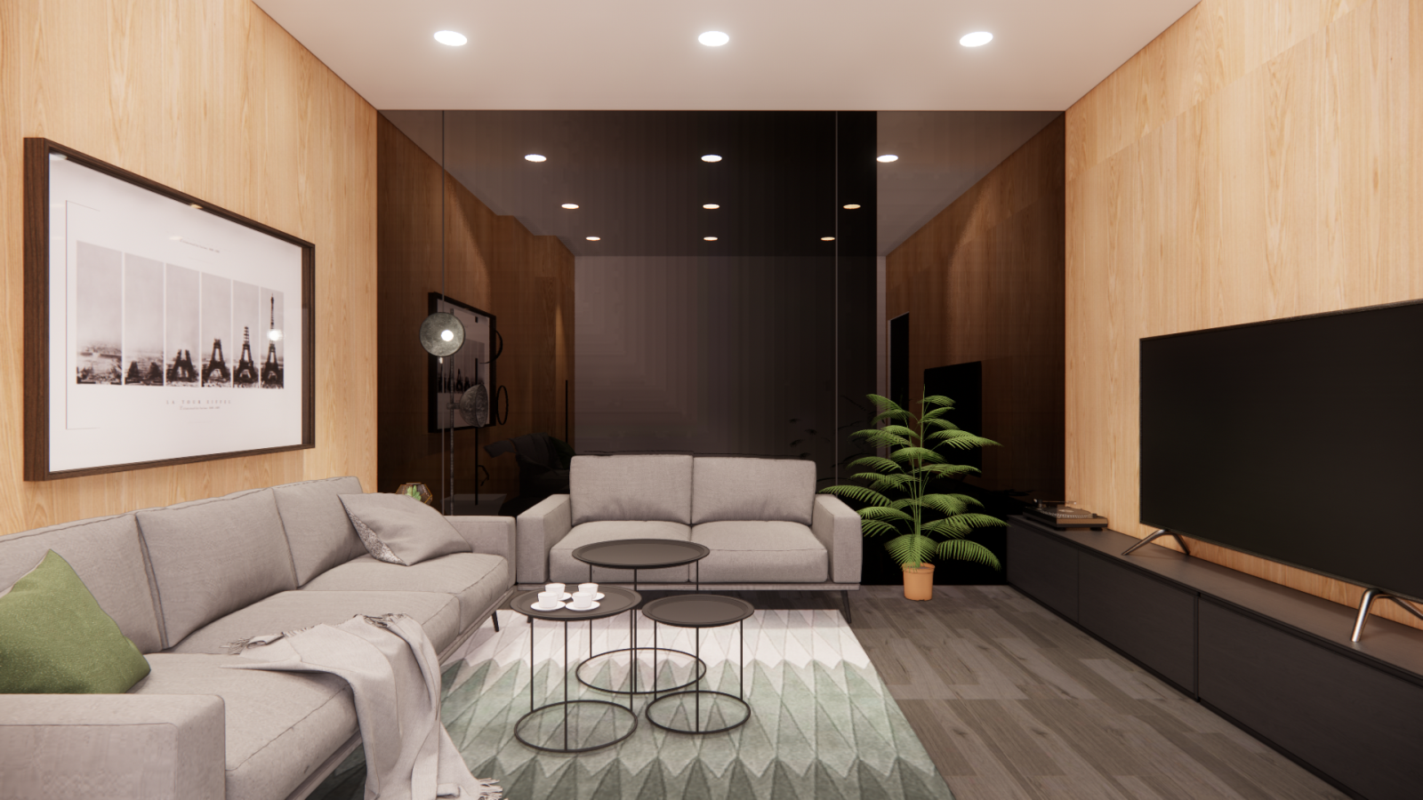 材料計畫:淺色大理石鋪面 / 暖木質飾板 / 曲面石膏造型板 / 減壓圓角傢具系統