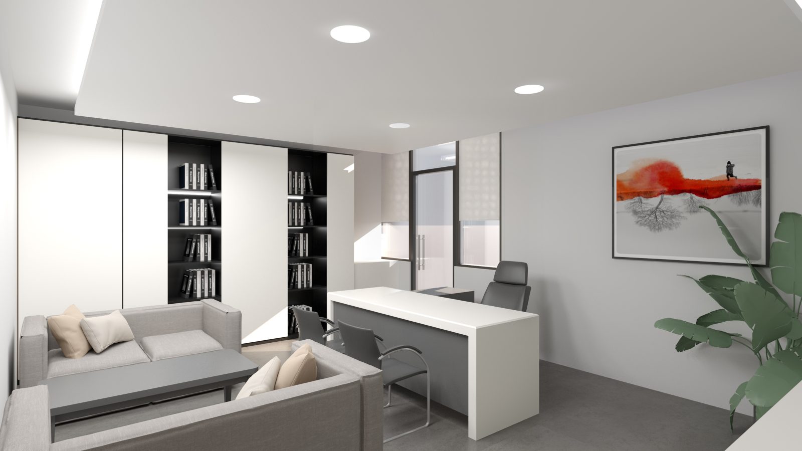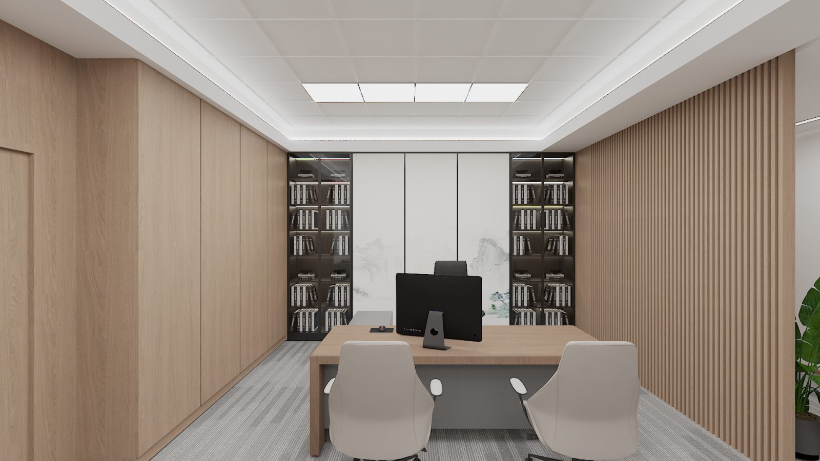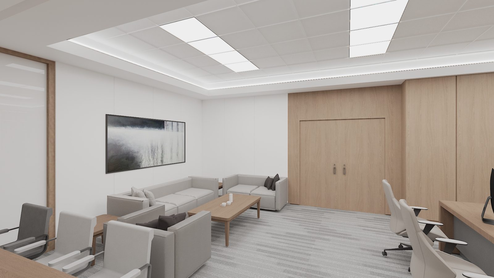 六樓與八樓辦公區以黑白色系搭配自然木質調。利用矮櫃作為動線緩衝,重新定義空間尺度,不僅降低進出衝擊,更在俐落線條中提升了公務場域的層次質感。