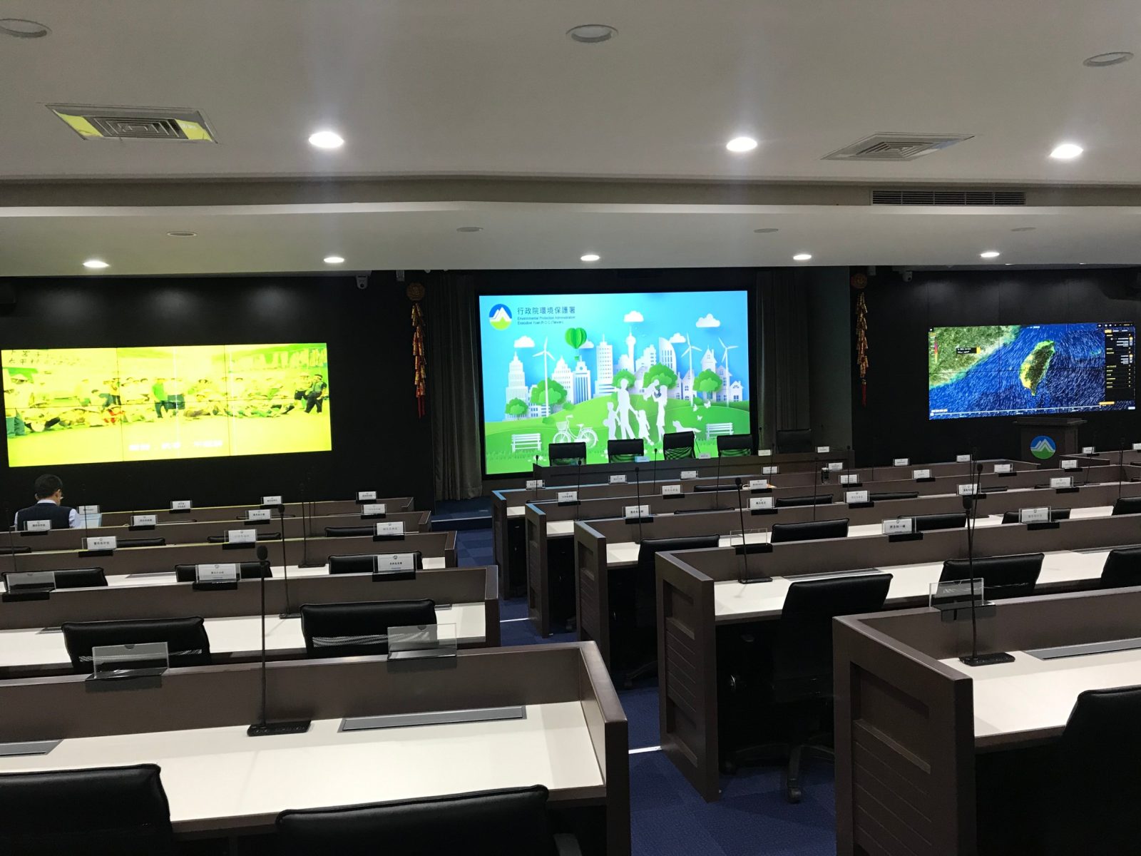 配置大尺寸高密度無縫拼接視訊牆,支援多來源感測數據即時投放。從空氣品質、廢水排放到全台感測網絡圖資,一目了然,強化數據判讀效率。