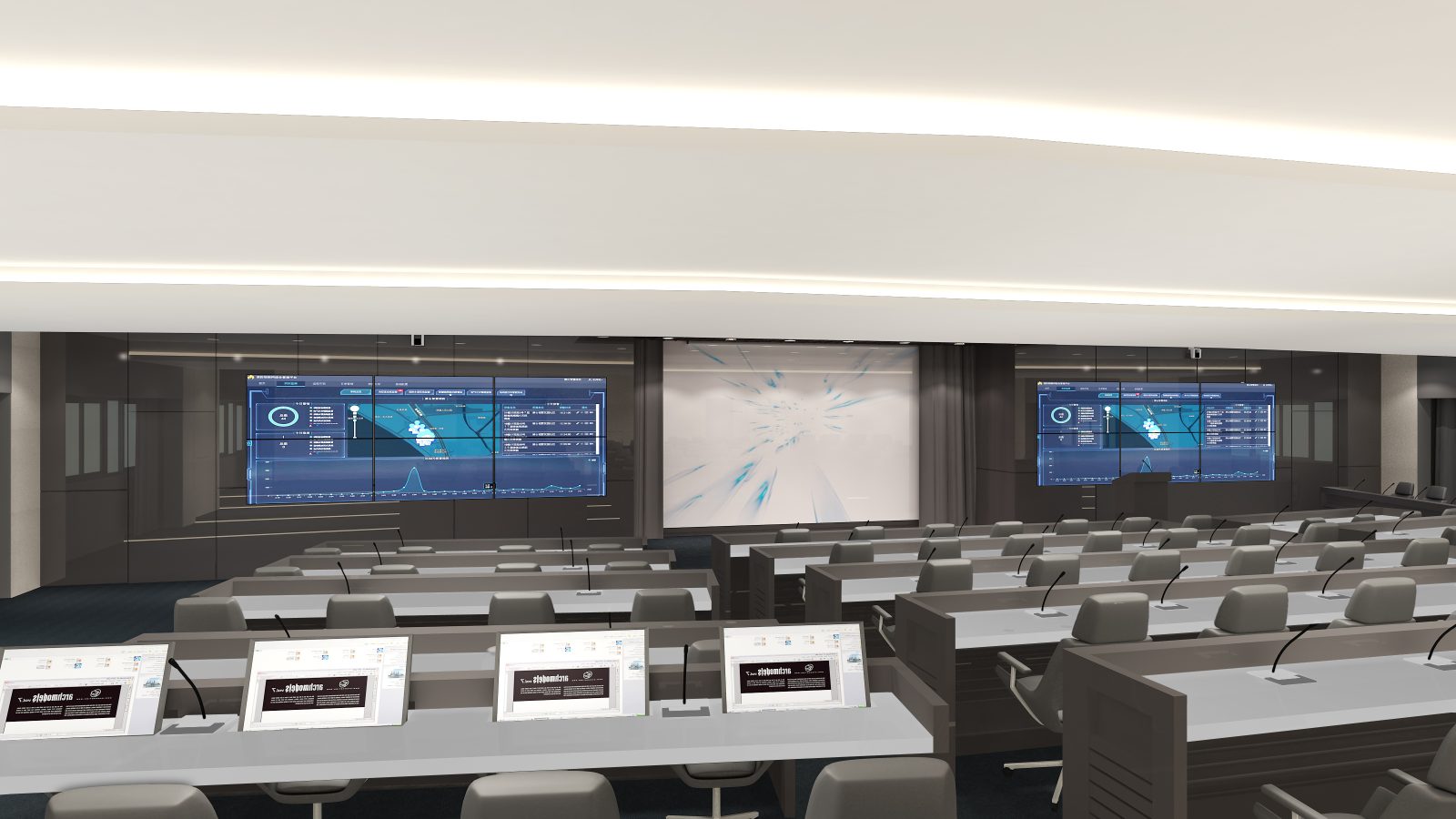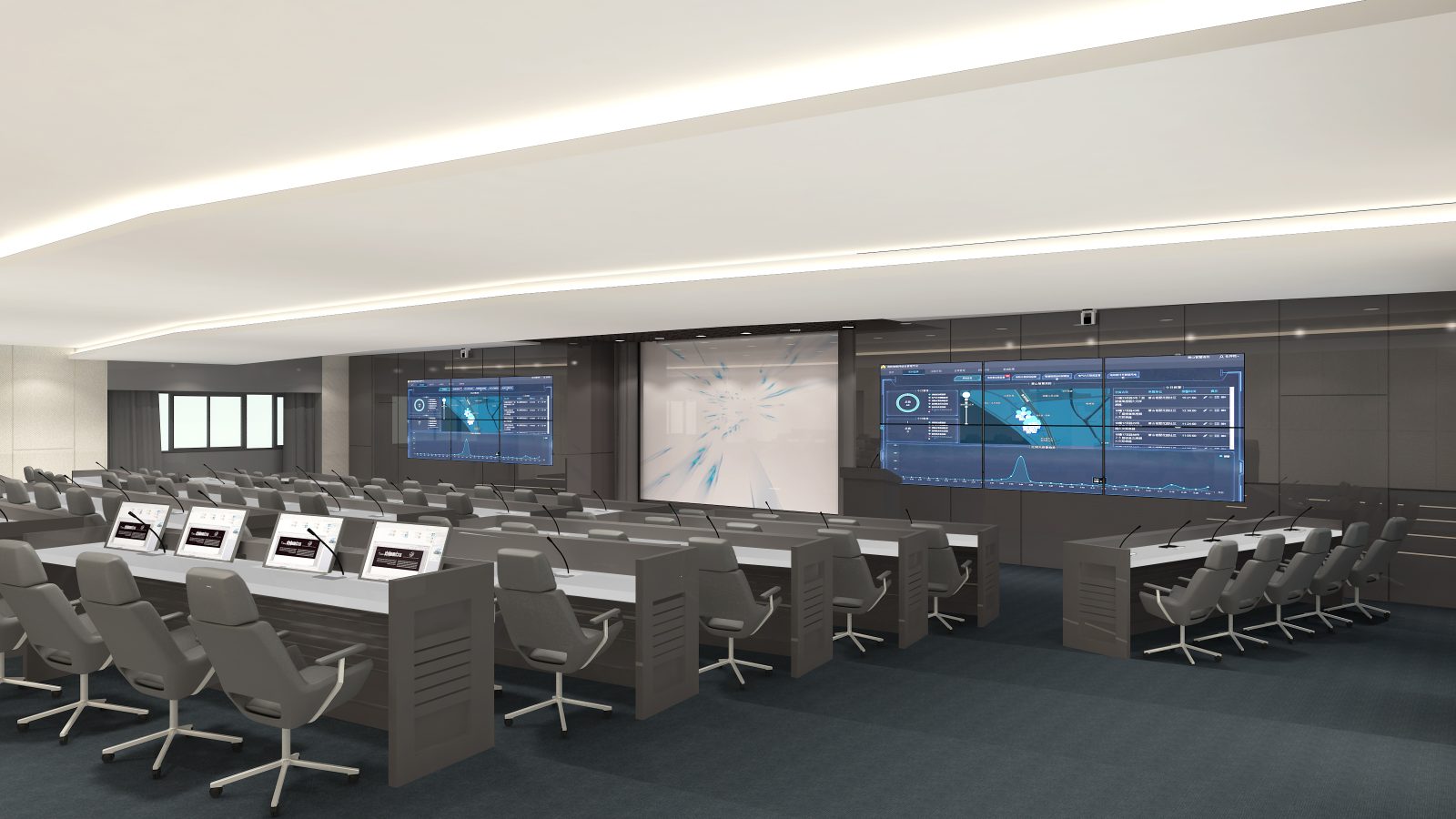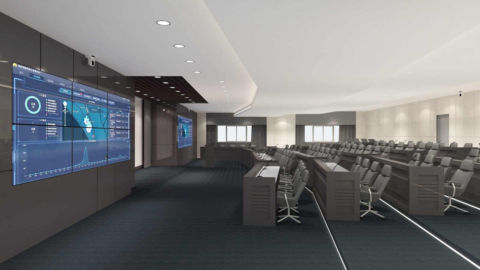 本計畫執行環境部物聯網感測數據應用中心設備委託規劃及專案管理技術服務,致力於打造符合「智慧政府」願景的高科技決策場域。設計重點在於高度整合無縫拼貼視訊牆、專業級視聽音訊設備及劇院式燈光控制。透過空間與資訊設備的同步管理,將繁雜的環境感測數據以視覺化圖表呈現於多維度環繞螢幕中。空間色彩採專業穩重的石墨灰結合現代木紋質感,營造沉穩且理性的監測環境,提供決策者最直觀、即時的資訊支援與指揮空間。