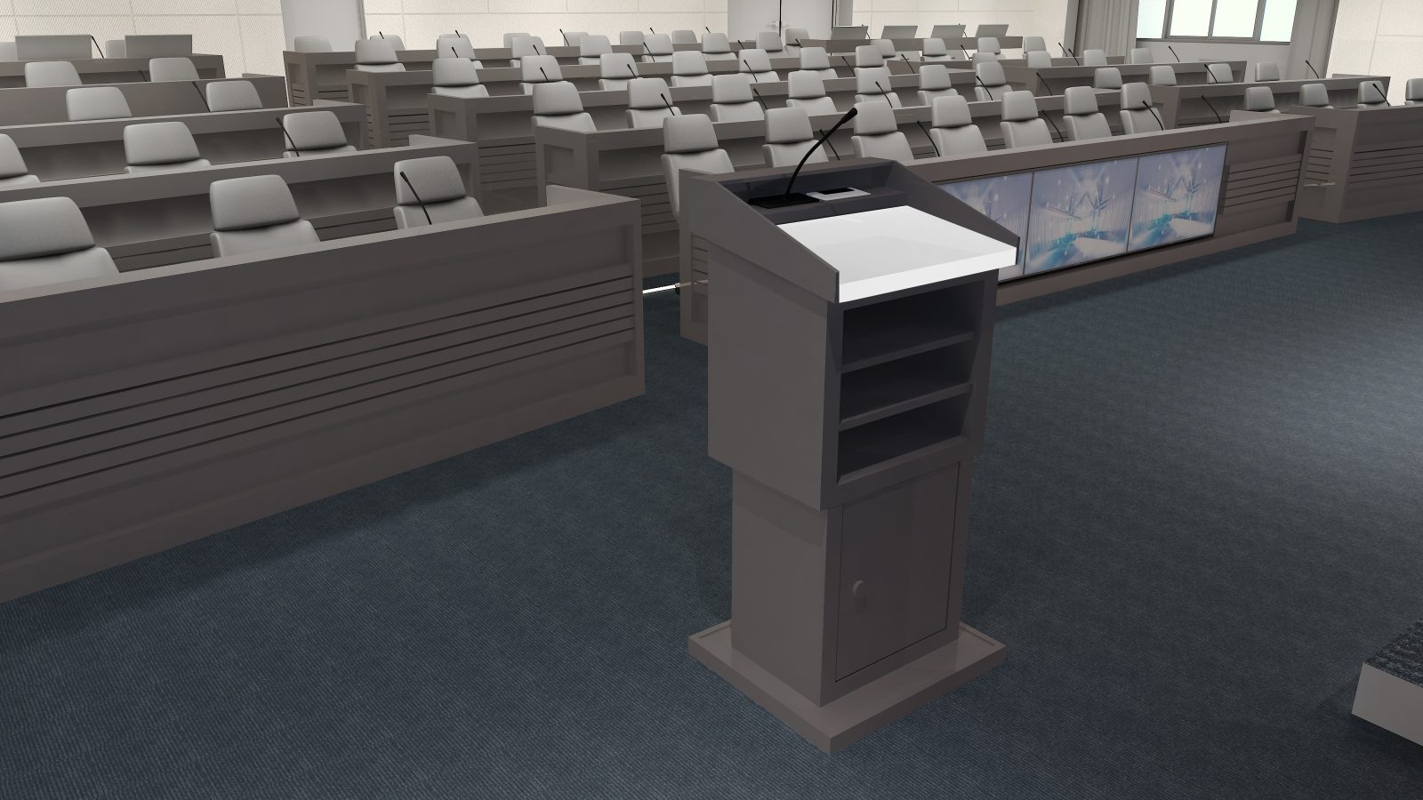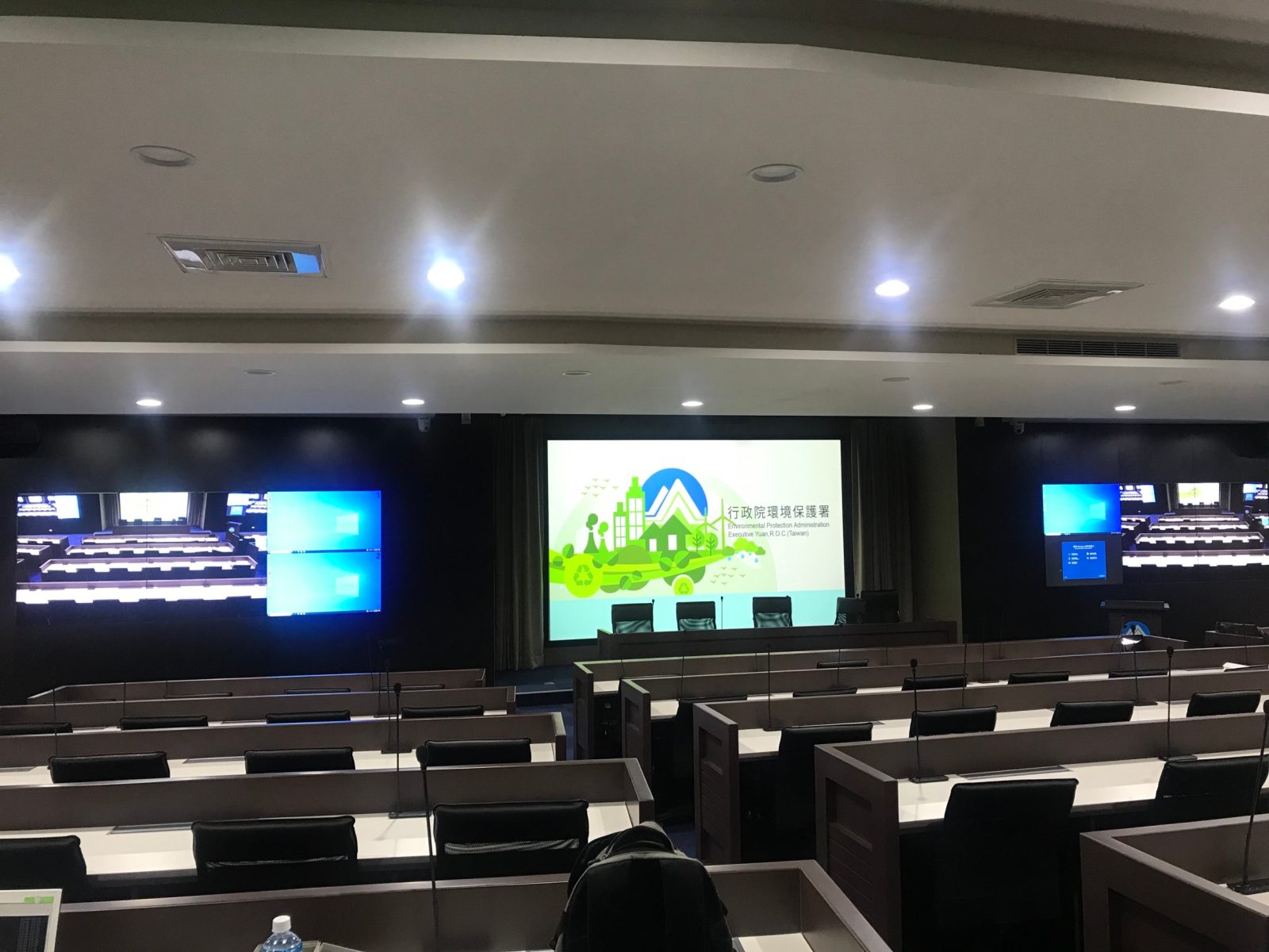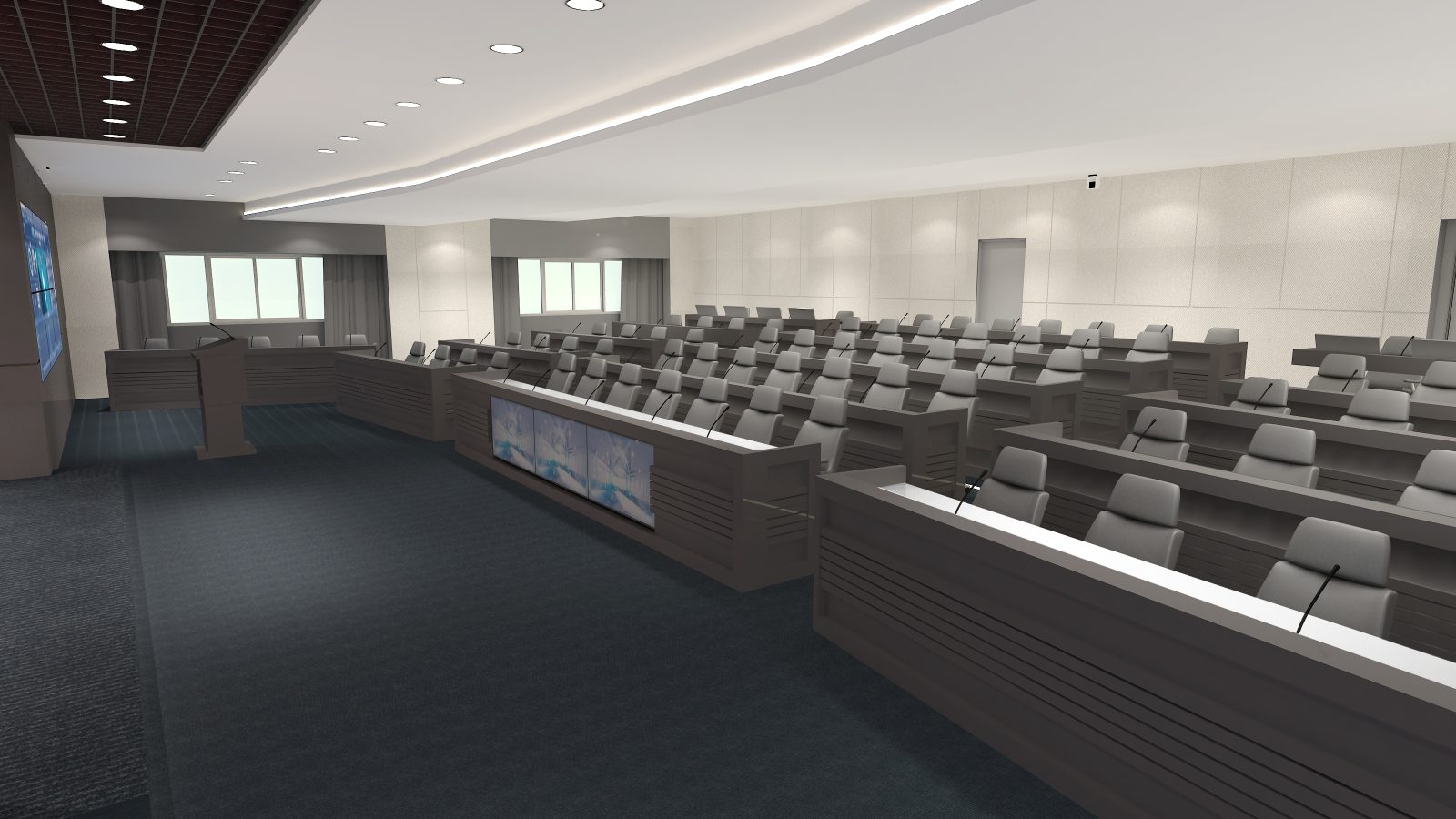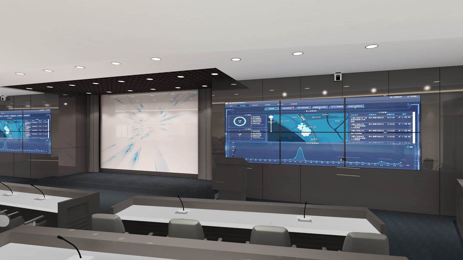 本計畫執行環境部物聯網感測數據應用中心設備委託規劃及專案管理技術服務,致力於打造符合「智慧政府」願景的高科技決策場域。設計重點在於高度整合無縫拼貼視訊牆、專業級視聽音訊設備及劇院式燈光控制。透過空間與資訊設備的同步管理,將繁雜的環境感測數據以視覺化圖表呈現於多維度環繞螢幕中。空間色彩採專業穩重的石墨灰結合現代木紋質感,營造沉穩且理性的監測環境,提供決策者最直觀、即時的資訊支援與指揮空間。