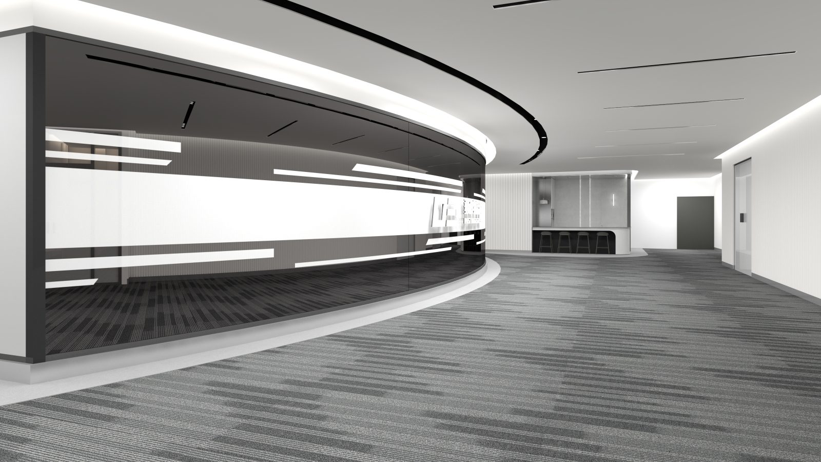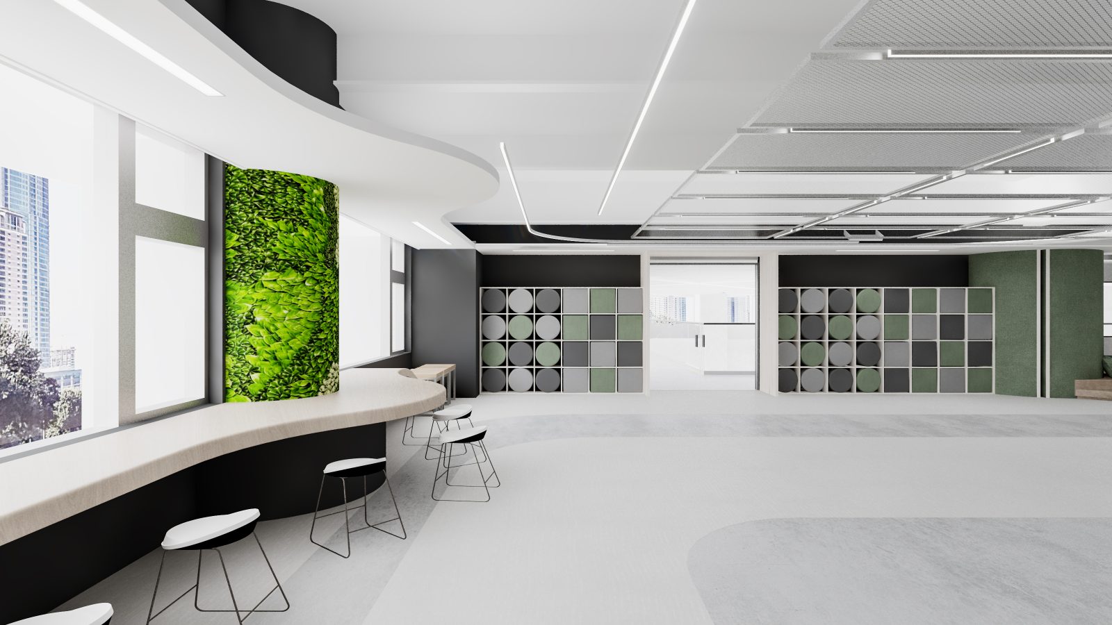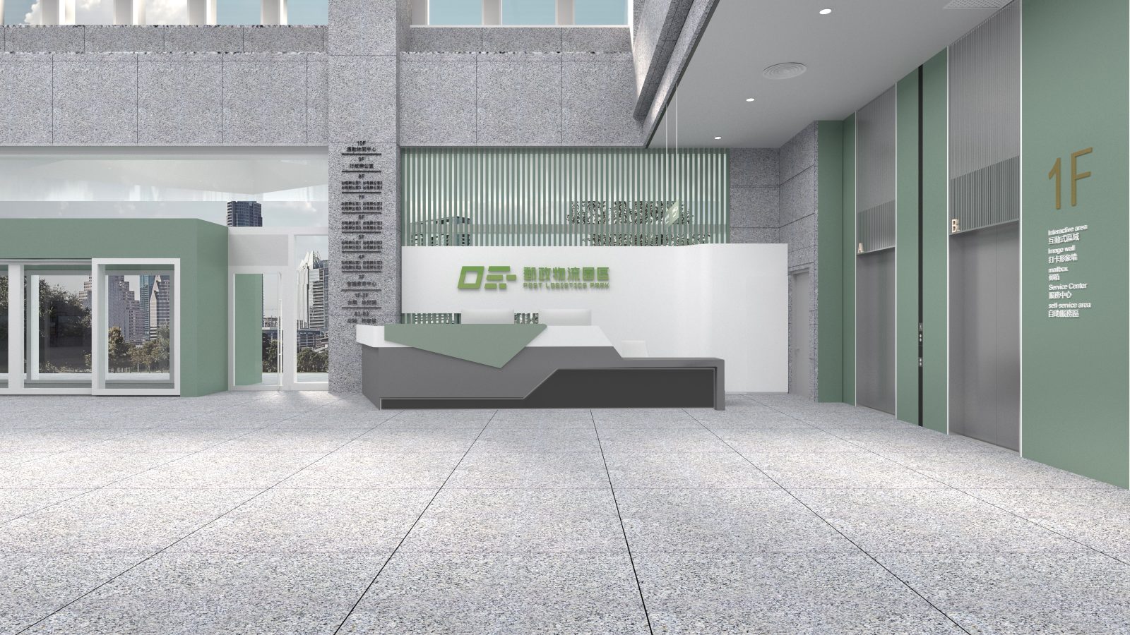 量體以清亮的白色搭配企業形象綠色點綴,展現專業效率。大廳包覆白色烤漆玻璃,並利用造型天花及燈帶勾勒出俐落線條;細緻的接待櫃台設計,使整體空間在步入瞬間即成為視覺焦點。